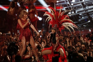 Indicada em dez categorias, Taylor ganhou quatro. Com o clipe "Bad Blood", ela levou o troféu do astronauta de "Vídeo do Ano" e "Melhor Colaboração". Já com o hit "Blank Space", ela ganhou nas categorias "Melhor Vídeo Feminino" e "Melhor Vídeo de Pop". Além disso, a cantora aproveitou a festa para fazer as pazes com Nicki Minaj eKanye West.